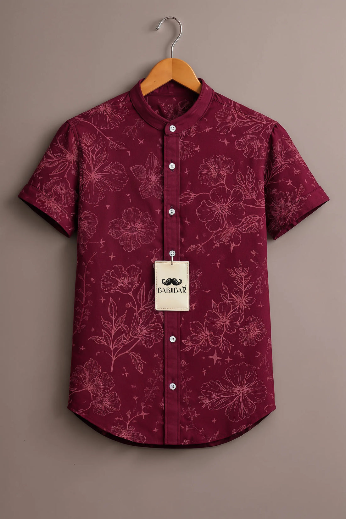 Men’s Wine Floral Print Mandarin Collar Shirt