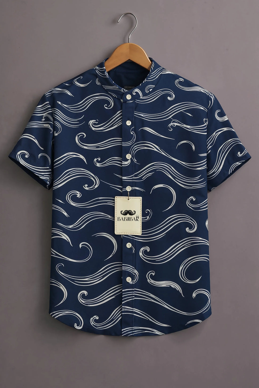 Men’s Navy Wave Print Mandarin Collar Shirt