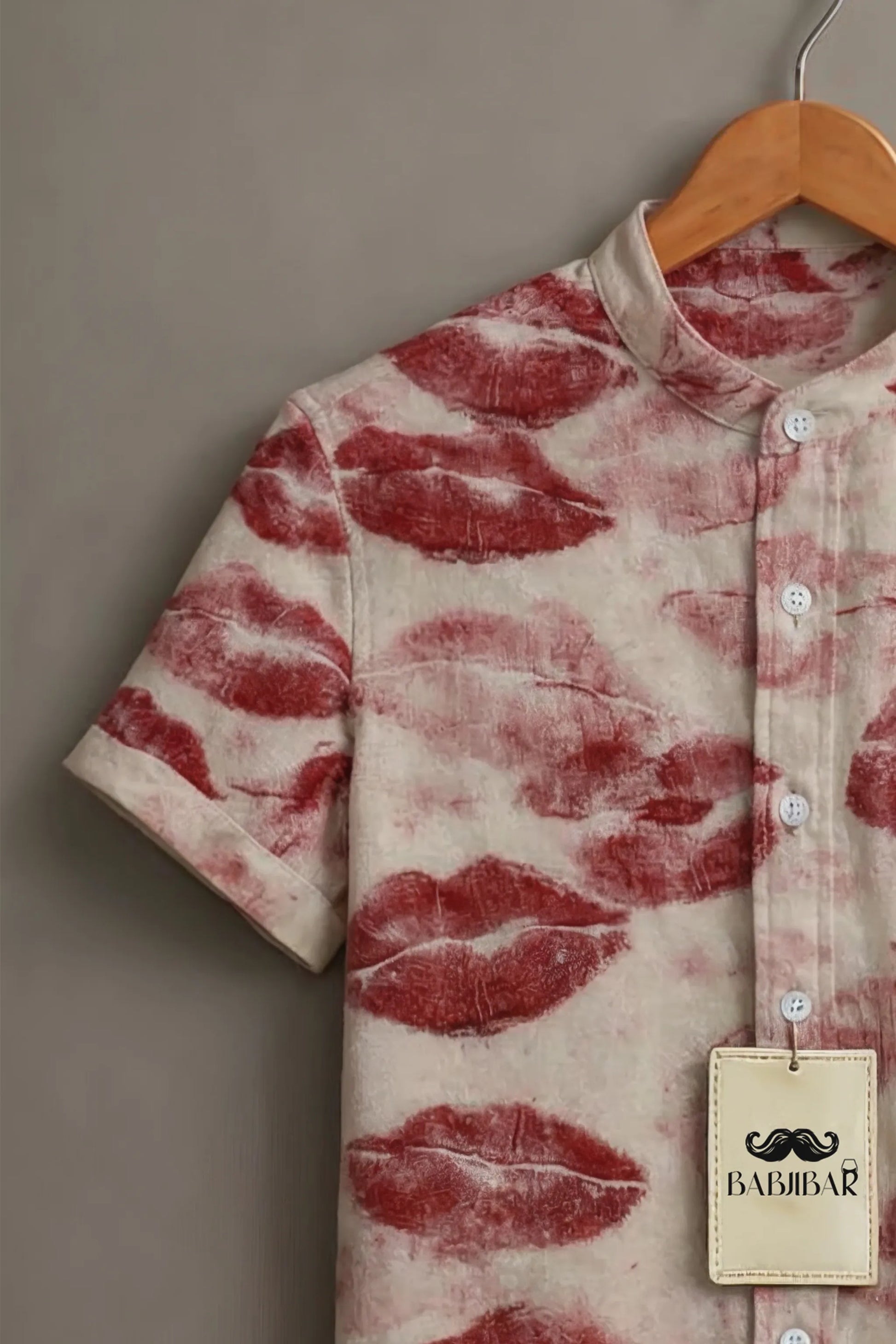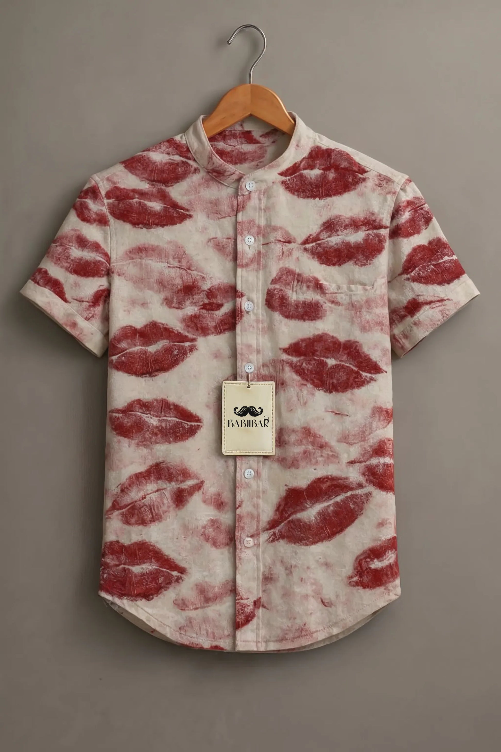 Make a confident style statement with this bold yet refined men’s printed shirt, designed for those who like their fashion expressive and contemporary. Set on a soft cream base, the shirt features an all-over artistic lip-print motif in rich red tones, creating a striking contrast that instantly stands out.