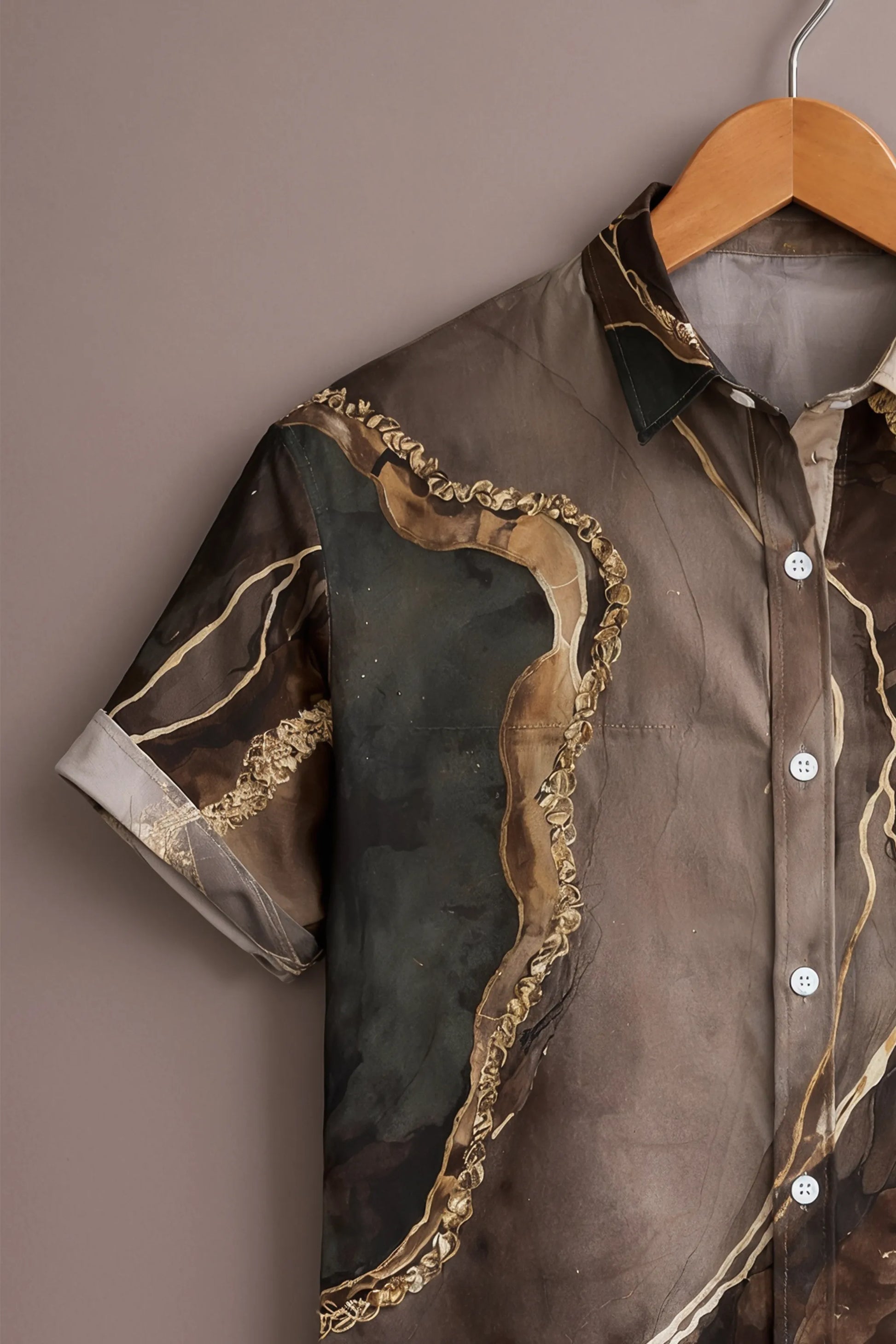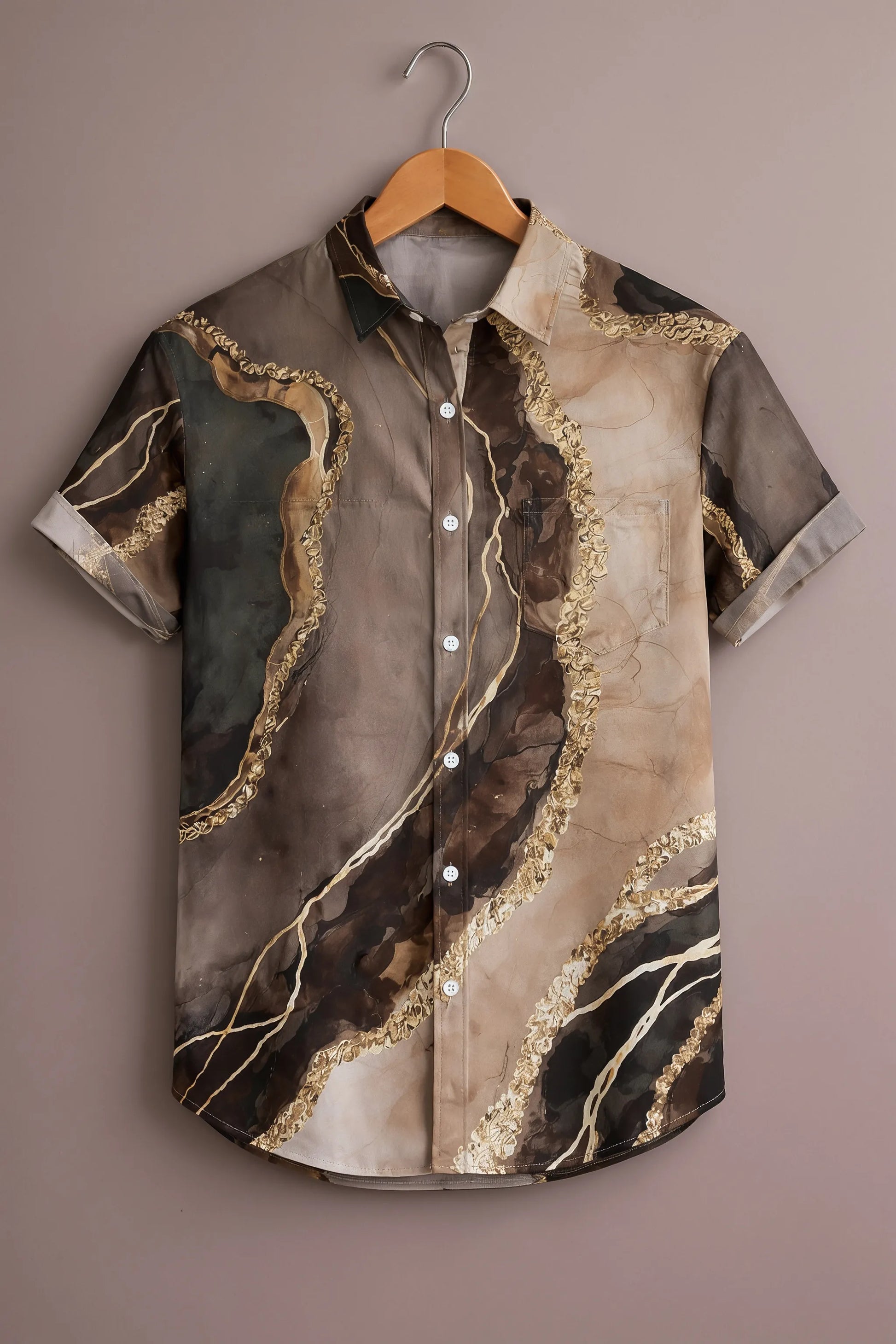 Inspired by natural stone textures and luxury art finishes, this men’s marble abstract print shirt delivers a refined statement look with effortless elegance. Designed in rich earthy tones of beige, brown, charcoal, and taupe, the shirt features fluid marble patterns highlighted with gold-accent detailing that add depth, texture, and a premium visual appeal.